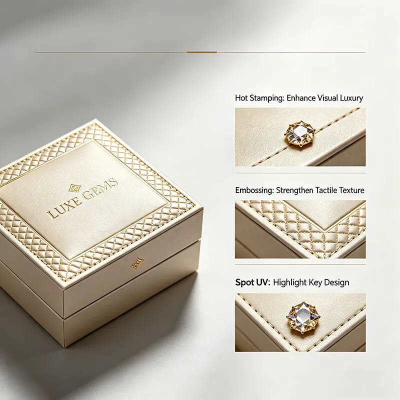 Compare foil stamping, embossing, and spot UV for jewelry packaging. Learn costs, material suitability, and get a decision tree to boost brand premium. Perfect for custom printed jewelry boxes.