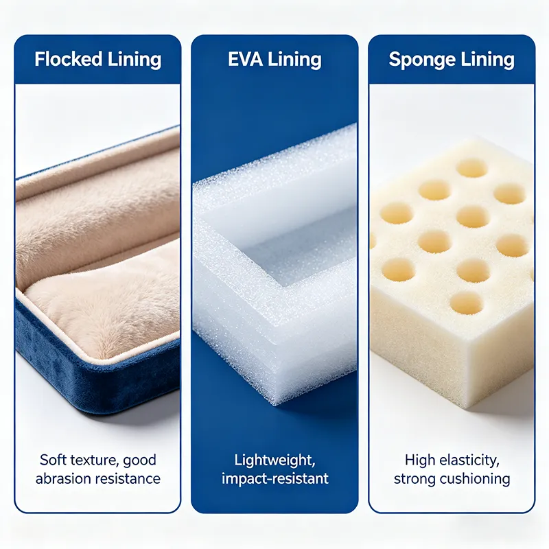Compare velvet, EVA and sponge for jewelry box linings. Density, thickness, customization accuracy, cost and eco-friendliness. Essential reading for jewelry box manufacturers and custom jewelry box manufacturers.