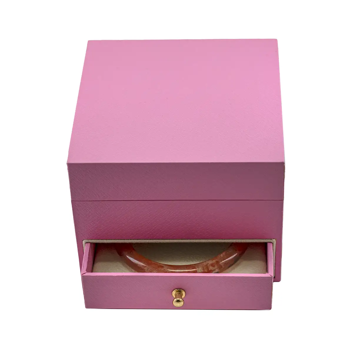 Featuring a textured pink exterior, the box is fully lined with soft velvet that effectively absorbs shock and prevents scratches, offering comprehensive protection for your precious pieces. The flip-top lid opens and closes smoothly, while the drawers glide effortlessly for convenient everyday use.